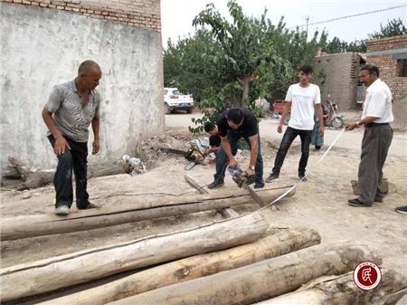 在阿伊图热姆·斯坎旦尔、哈斯亚提罕·伊玛木尼亚孜家,大家爬上房顶,量好所需木料尺寸,拿起电锯锯除多余木料,将一根根木头拉上房顶,看着一根根木头错落有致地放置房顶,院子被打扫得干干净净,村民脸上露出会心的笑容。