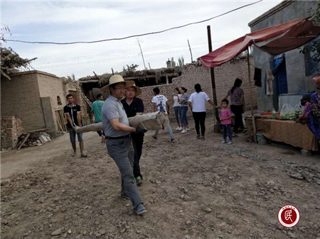 新疆民生网(刘广卿)随着秋天到来,温宿县克孜勒镇喀拉萨村安居富民房建设进入紧张施工阶段。由于个别家庭缺少劳动力,虽然房屋主体建成,但上木头、房屋封顶成了难题。