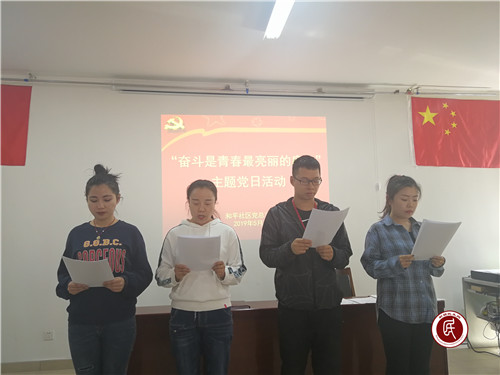 为深入学习习近平总书记的重要讲话,进一步增强党总支的凝聚力,深入开展“不忘初心 牢记使命”主题教育活动,传承发扬五四精神,倡议广大社区青年工作者扎根社区、服务群众、奉献基层,使党员永葆先进性,2019年5月15日,和平社区党总支举办“奋斗是青春最亮丽的底色”主题党日活动暨和平社区“大党委”工作会议。