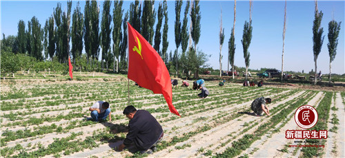 其实喀拉喀什村第一书记、工作队队长艾尼瓦尔早就想到了这件事,一直把这件事放在心上,并做好了计划。艾尼瓦尔书记组织工作队队员和村两委班子成员并召集了一些党团员志愿者成立志愿者服务队,继续深入田间地头,和群众一起锄草、挑苗。5月底的阿克苏天气已经很热了,但是也抵挡不住志愿者队伍帮扶解困的热情,每一位志愿者脸上都挂着汗水和微笑,虽然很辛苦,但是都很快乐。