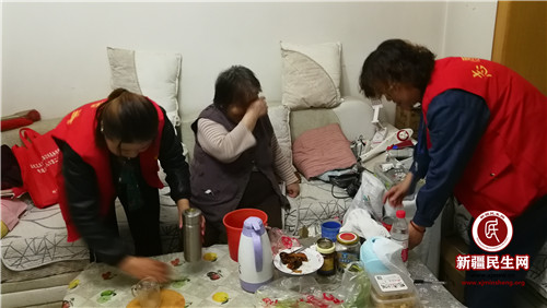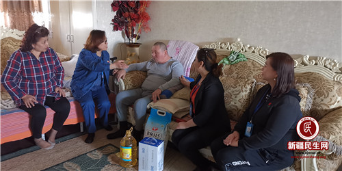 低保户托胡·木哈因病长年卧床,他的爱人因照顾他一直没有就业,儿子还在外上大学,家庭十分拮据。社区为帮扶他们一家,请他爱人帮助打扫社区卫生,社区每位工作人员出资为她发放工资用于贴补家用。当托胡·木哈看到又来慰问的社区工作人员,还帮助维修好了过道的顶灯,激动地让家人扶起坐到沙发上,无法正常言语的他口中一直啊呜啊呜的说着含糊的话语,因脑梗不受控制的手合在一起,表达他心中深厚的感恩之情。