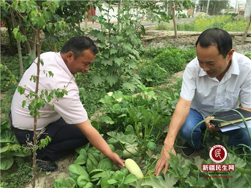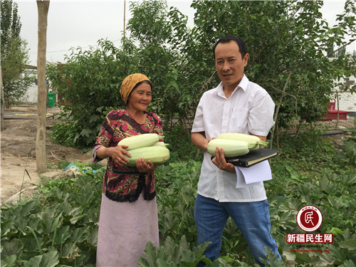贫困户庭院里蔬菜的长势是工作队最牵挂的事情,6月13日这天,工作队来到努尔尼沙汗·托合提大妈家,远远就看见大妈在自家菜地里忙碌的身影。