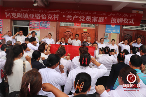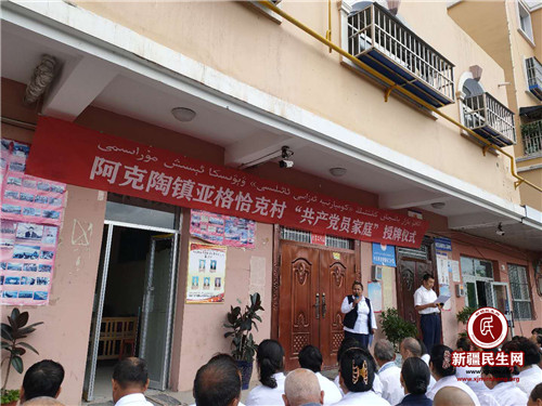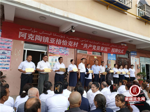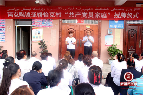 新疆民生网(王艳青)2019年6月24日,阿克陶镇亚格恰克村举行“共产党员家庭”授牌仪式,向该村43户党员家庭发放标牌,激励全村党员争示范、做表率,发挥先锋模范带头作用,助推乡村振兴发展。阿克陶县委常委、阿克陶镇党委书记出席并作了重要讲话。